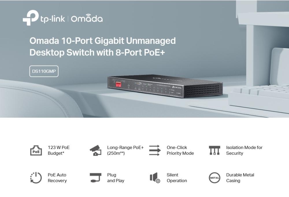10-портов неуправляем комутатор TP Link Omada DS110GMP с 8-портов PoE+