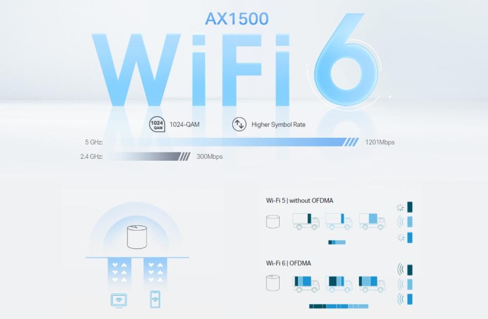 По-бързи връзки: Wi-Fi 6 скорост до 1500 Mbps—1201 Mbps на 5 GHz и 300 Mbps на 2,4 GHz.†