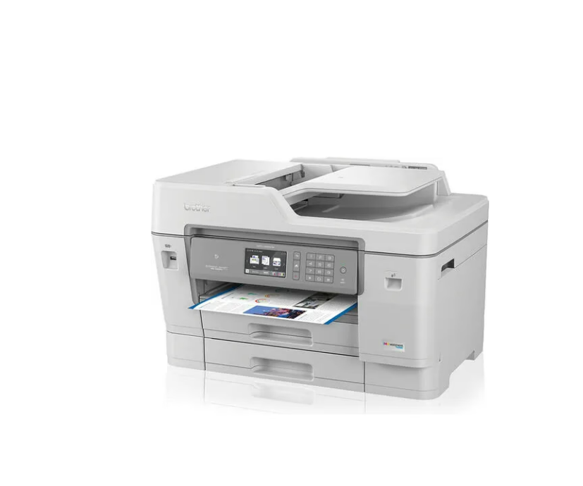 | You can ink big with MFC-J6955DW Brother INKvestment Tank Color Inkjet all-in-one printer. Powered by Brother MAXIDRIVE Inkjet Technology, this dynamic printer delivers super sharp images, text, and graphics at print speeds up to 30 pages per minute, black and color. Print, scan, fax and copy up to 11" x 17" (ledger) size paper. The advantage of the MFC-J6955DW is that it offers a second paper tray for a 500-sheet total paper tray capacity, plus single pass duplex copy and scan capabilities. Triple Layer Security features help safeguard sensitive documents while printing and use the NFC card reader for easy badge authentication. | |